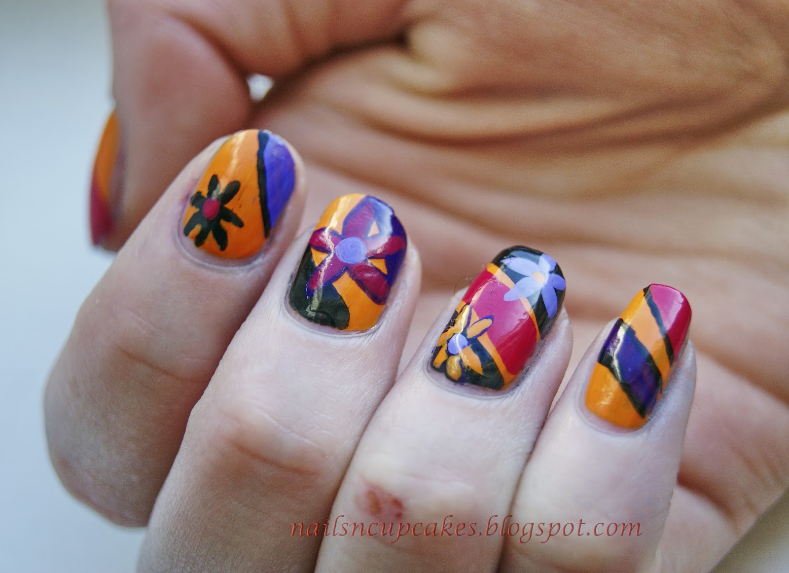 I made this using China Glaze - Papaya punch and Heli-yum a purple jelly from Urban outfitters and black and white. The colors are very hot and strong, not something I use a lot in nail art, but I dig it!